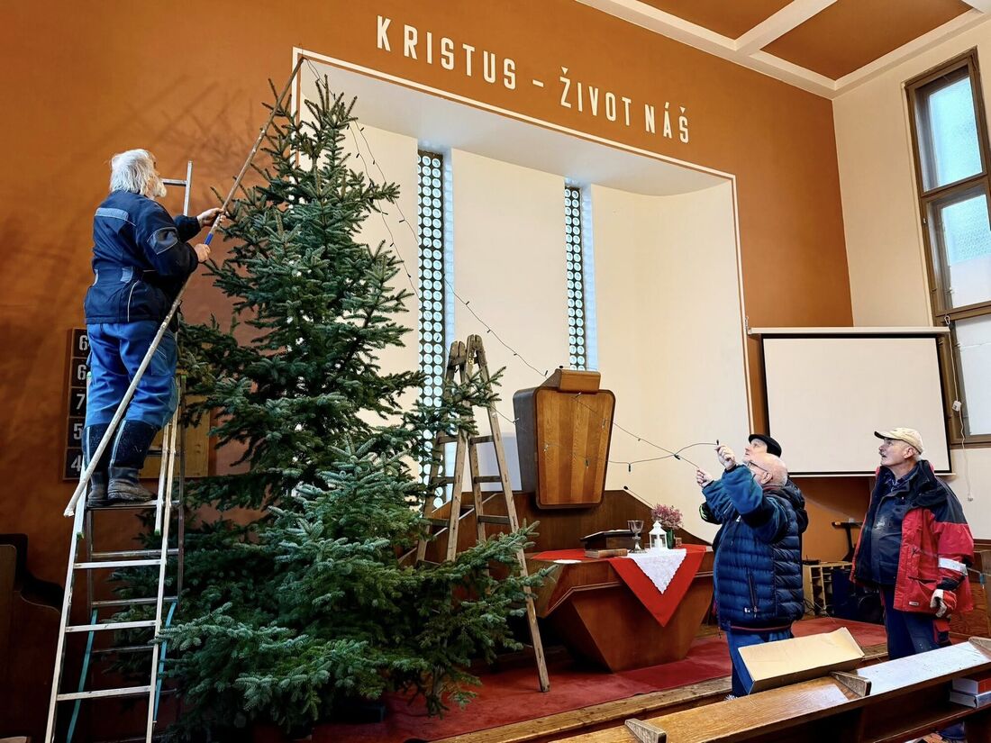 Každý rok máme v modlitebně od adventu až po Tři krále krásný vánoční strom. Je to dílo dárců, kteří nám jehličnan věnují, ale hlavně naší skvělé mužské party, která strom uřízne, přiveze, vmanévruje na místo u kazatelny a ozdobí. Píše se to jednoduše, ale legrace to tedy není.