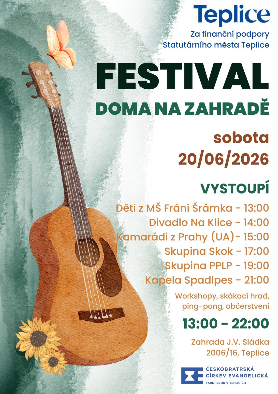 Akce se koná v sobotu 20. června 2026 od 13:00 do 22:00 na Zahradě J. V. Sládka 2006/16 v Teplicích.